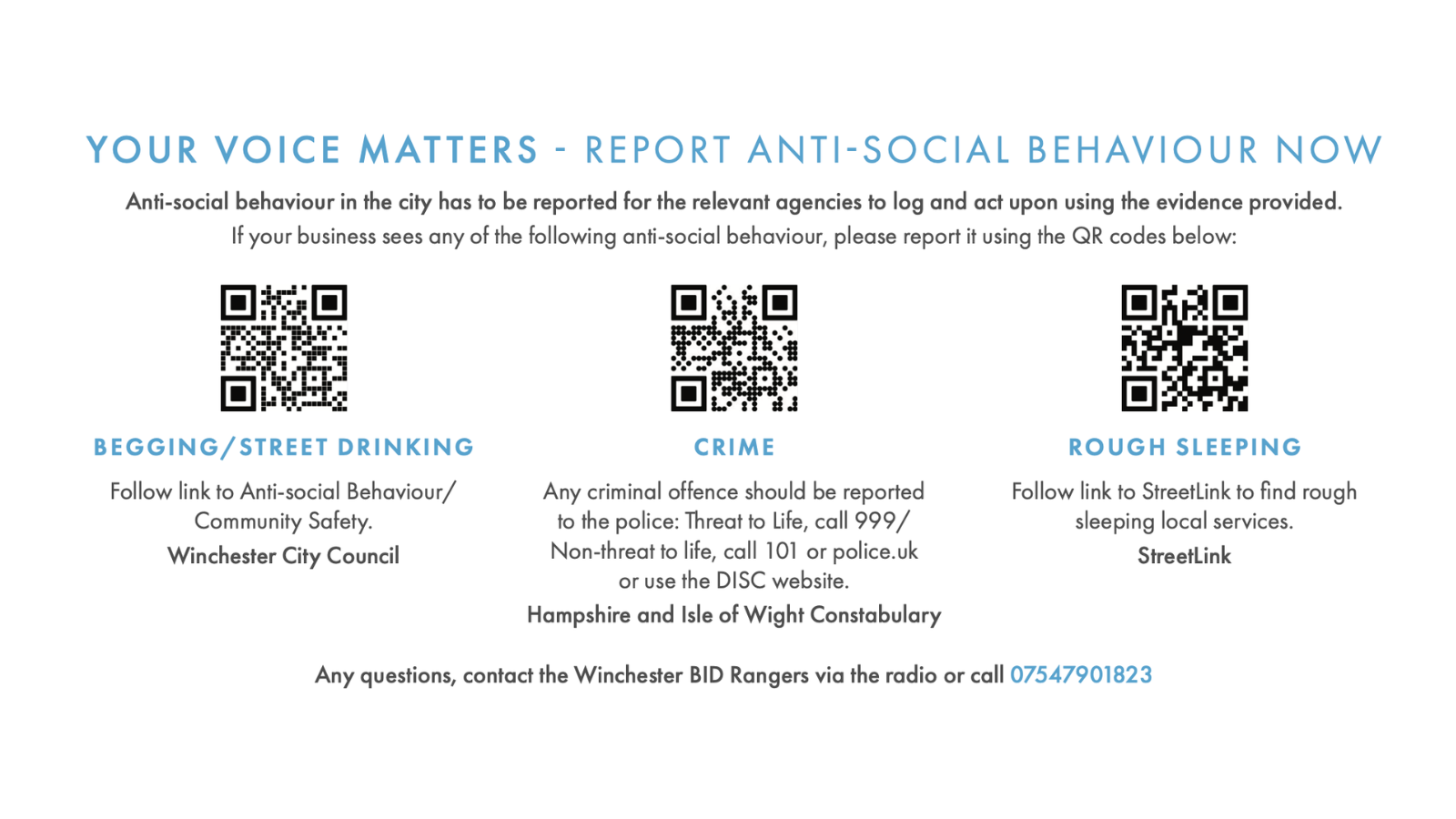 Working closely with the Police and other agencies, we introduced the Winchester BID Rangers scheme in 2018 to help reduce business crime and provide additional security in the city centre. The Rangers are security trained and accredited and patrol Winchester city centre streets as part of the BID’s commitment to providing a safer environment and to help reduce low level crime and antisocial behaviour. The Rangers also assist businesses to report crime and antisocial behaviour to the appropriate authorities and please see below for further information. In addition, the Rangers play an important ambassadorial role in the city and help tourists and visitors with directions, information and assistance. To contact the Rangers, please call 07547901823 or send an email to: winbid@venturesec.co.uk.